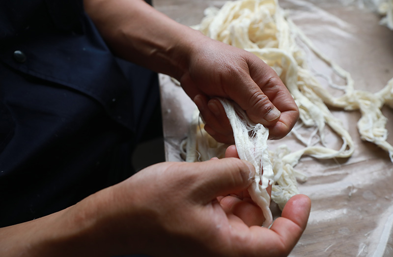 徽州傳統(tǒng)手工楮皮紙,采用傳統(tǒng)手工抄紙工藝,經(jīng)過(guò)27道工序,以手工精細(xì)制作而成,產(chǎn)品主要有楮皮紙、云龍紙、皺紋紙、落水紙、棉紙、版畫(huà)、攝影畫(huà)、手撕畫(huà)專(zhuān)用紙。 生產(chǎn)工序: 浸泡—→腳踏—→清水蒸煮—→切料—→石灰漿浸泡—→蒸煮—→自然漂洗—→腳踏